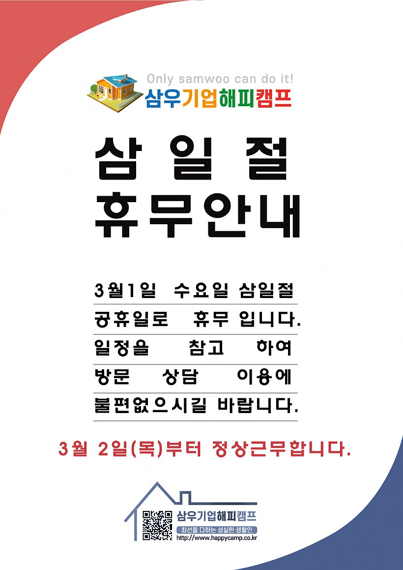3월 1일 수요일 삼일절 공휴일로 휴무입니다.