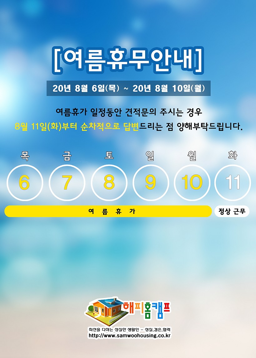 8월 6일부터 10일까지 여름휴가로 휴무를 하게 되었습니다.